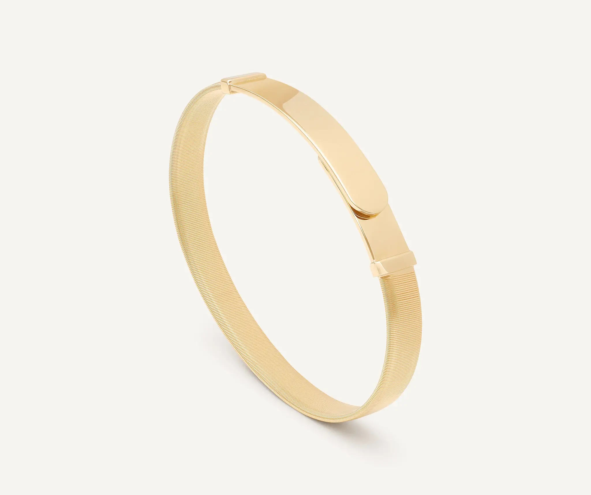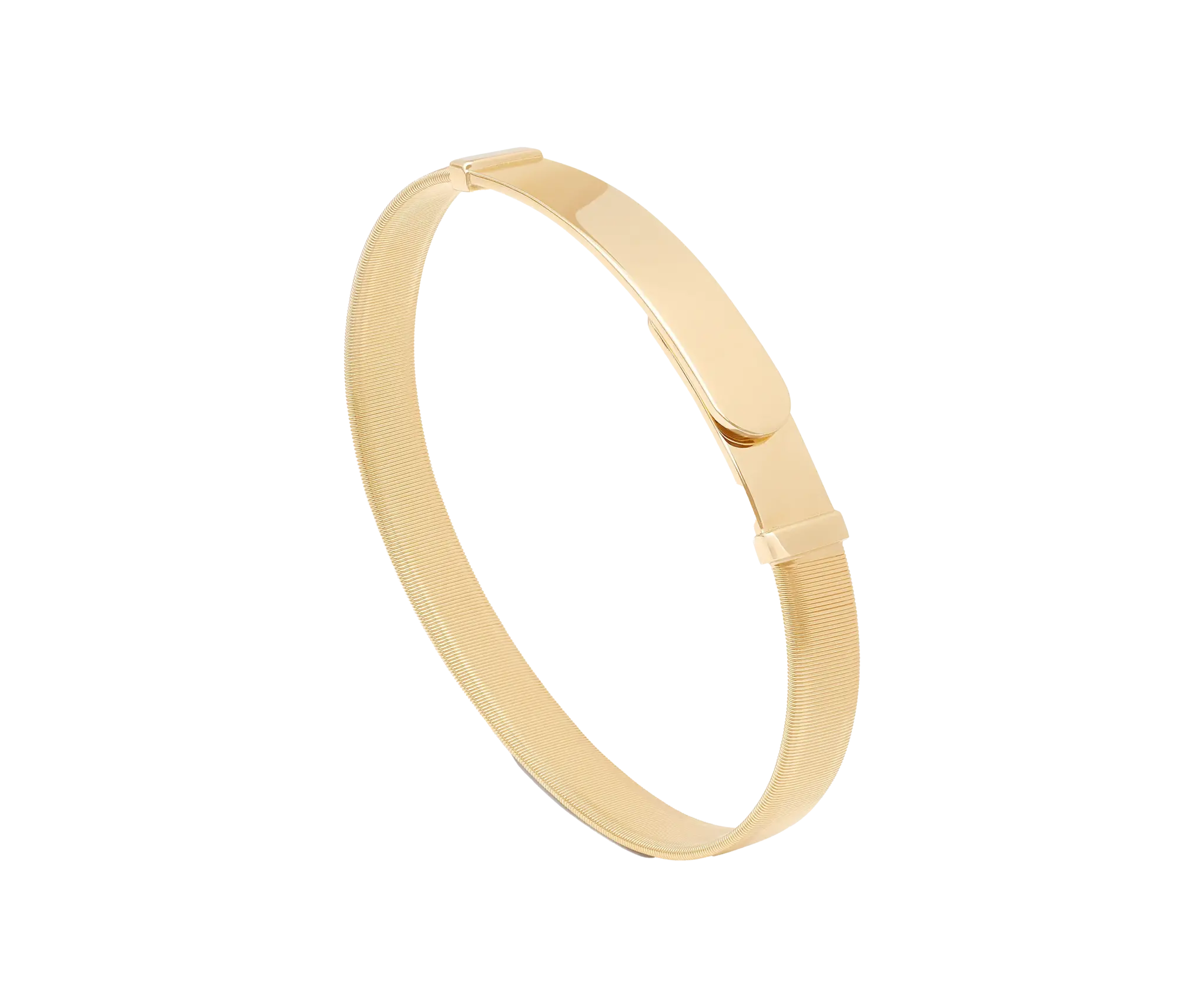 Lineair en essentieel, deze enkelstrengs armband van 18kt geelgoud valt op door zijn unieke draagbaarheid. Een enkele draad van platte spiraaldraden, zorgvuldig gemaakt met behulp van de exclusieve spoeltechniek. Elegant op zichzelf, perfect te combineren met de andere armbanden in de collectie.